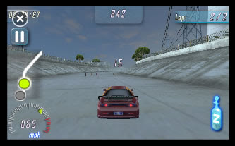 Graficamente non è il massimo paragonato al suo concorrente, dato che a parer mio non cura a fondo i particolari che in questo caso farebbero la dfferenza. La giocabilità è discreta potendo scegliere per sterzare accelerometro che sfrutta il G-Sensor del device, il volante sterzando quindi tramite esso e la modalità toccare che ti permette di sterzare tappando a destra o a sinistra dello schermo. Tutto questo è settabile dalle opzioni dove troviamo pure la possibilità di disattivare gli effetti sonori del gioco e la possibilità di modificare la telecamera.