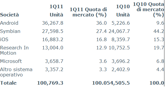 “Gli smartphone hanno rappresentato il 23,6 per cento delle vendite globali nel primo trimestre del 2011, con un incremento dell’ 85 per cento anno su anno”, ha dichiarato Roberta Cozza, analista principale di ricerca di Gartner. “Questa azione sarebbe stata ancora più elevata, ma i produttori hannoannunciato una serie di dispositivi di alto profilo nel corso del primo trimestre del 2011 che non sarebbero arrivati entro il secondo trimestre del 2011. Crediamo che alcuni consumatori hanno ritardato i loro acquisti per aspettare questi modelli. ”