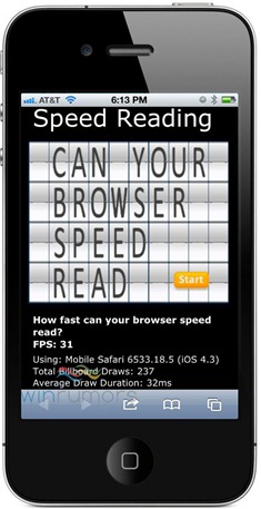 Il problema di fondo di questa comparazione, sta nel fatto che si è comparato la più recente versione beta diiOS5 contro una vecchia versione beta di Mango, precisamente quella mostrata al MIX11. Infatti durante il MIX11 di Las Vegas è stata testata la velocità di rendering HTML5 su diversi terminali, mostrando questi risultati: Windows Phone ha totalizzato ben 26 FPS, Android 11 FPS e iOS solo 2 FPS.