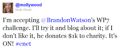 La giornalista di CNET, Molly Wood, ha risposto via twitter, accettando la “sfida” di Brandon Watson. Nel caso Windows Phone Mango non sarà di suo gradimento, donerà i 1000$ in beneficenza.