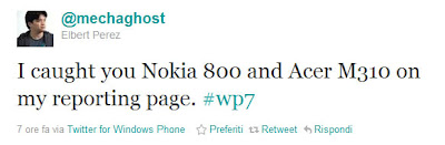 Tramite un Tweet, lo sviluppatore ci fa sapere che due nuovi dispositivi hanno popolato la sua pagina di segnalazione in uno dei suoi tanto apprezzati giochi. La pagina di segnalazione altro non è che la lista deidispositivi che hanno installato una sua applicazione. I due nuovi dispositivi prendono il nome di Nokia 800, probabilmente il nome ufficiale del primo dispositivo Windows Phone by Nokia con nome in codice Sea Ray e Acer M310, probabilmente un dispositivo diverso da quello già visto identificato dal nome Acer W4 annunciato qualche mese fa.